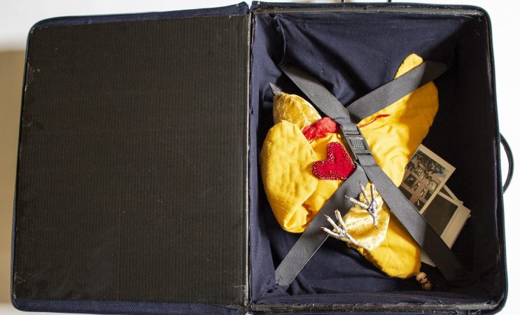 [IMAGE: Picture 1 shows yellow bird puppet with broken wing lying upside down strapped in a blue suitcase]