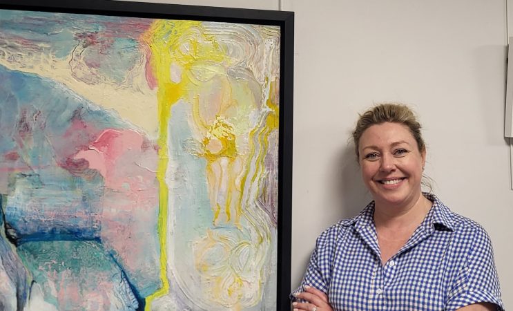 Image: Edwina Bracken on front of her exhibition in-situ at UHW, July 2025.