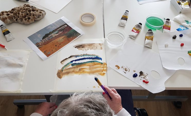 In each session, participants explore up to three paintings, making observations, describing, building connections and enjoying art together. The paintings usually have a theme, for example, landscapes, portraits, colour etc. Participants do not need any experience, or to know anything about art to take part in Open Gallery. The conversations are structured, and begin gently with questions such as “What do you see? What colours can you see?” before moving on to interpreting the painting, for example “What time of year do you think it is? Why do you think that?” etc. During some Open Gallery sessions participants have the opportunity to make art in response to the paintings in the room. Each session lasts about one hour and finishes with a cup of tea and a lively discussion!