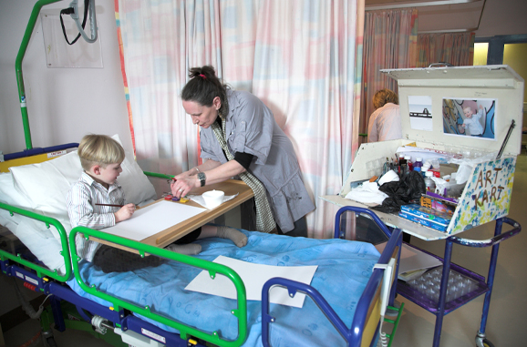 The Art Kart begins. This brightly coloured refurbished medicine trolley has become a regular and welcome sight in the corridors of the hospital, bringing art materials to patients on the Paediatric Ward and Renal Dialysis Unit.