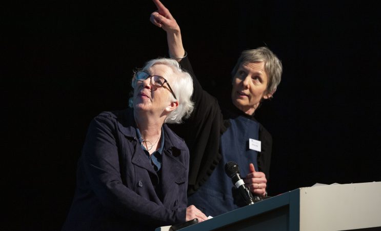 Picture shows artists Caroline Schofield and Jill Bouchier presenting their case study on Open Gallery, an inclusive art viewing project, at Arts and Health: Check Up Check In 2019.